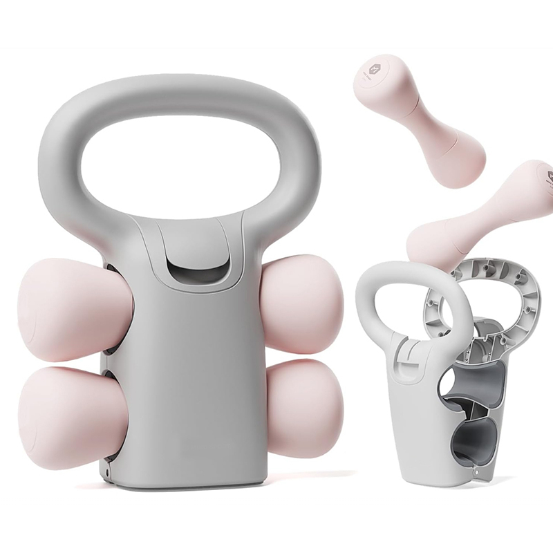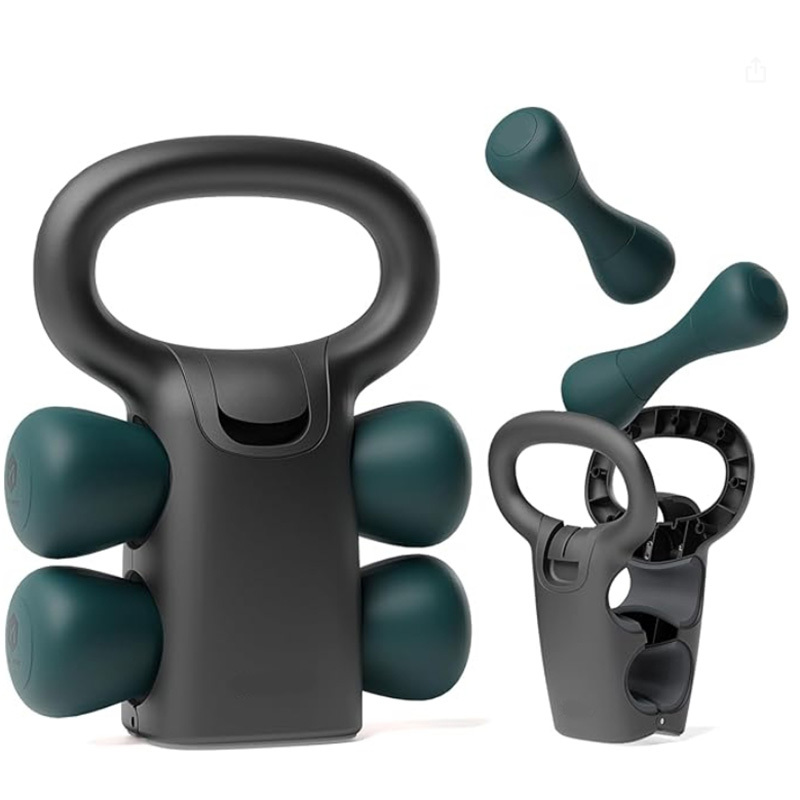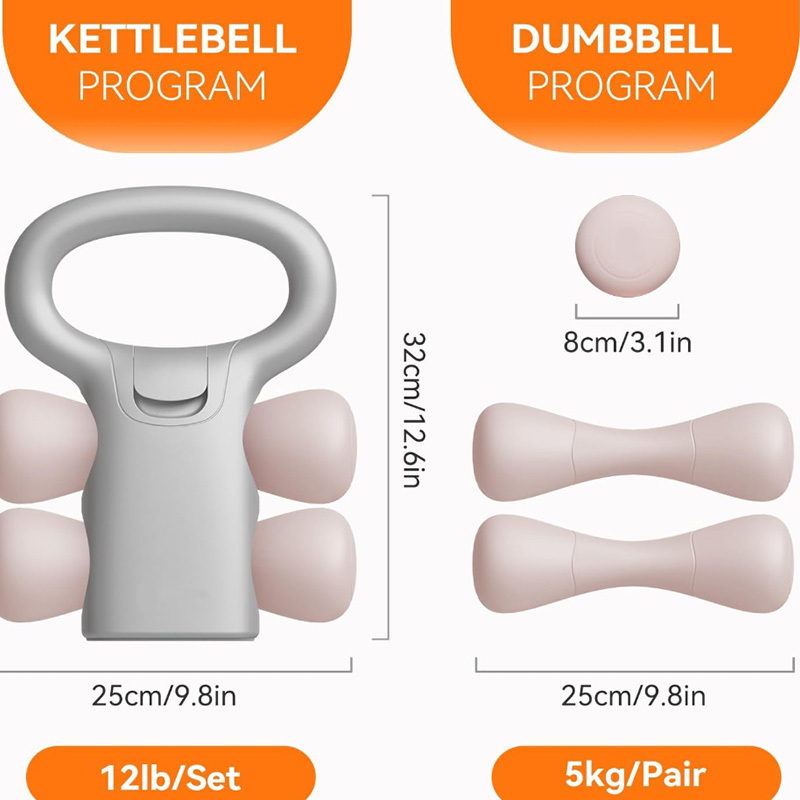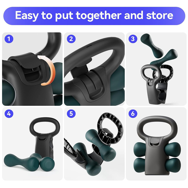 Innovatively combining the kettlebell with two dumbbells and making it easy to remove. Simply open the hinge handle to remove both dumbbells.